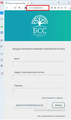 Портал размещен в сети Интернет по адресу https://client.bsspharm.ru/ и совместим со всеми с интернет браузерами. Портал предоставляет доступ контрагентам компании в личный кабинет.
