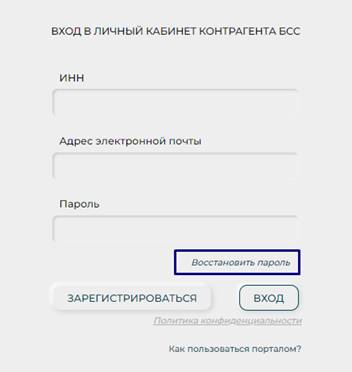 В случаях, когда пароль доступа в личный кабинет был забыт или утерян – его можно восстановить. Для этого на странице авторизации в личном кабинете (https://client.bsspharm.ru/) необходимо нажать «Восстановить пароль», как видно из рисунка 3.5.1.