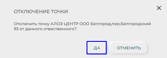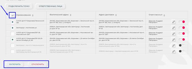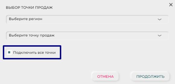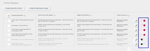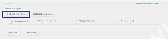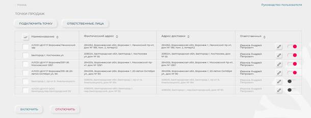 - отображение перечня подключенных точек продаж; - подключение точек продаж; - отключение точек продаж; - доступ к разделу «Ответственные лица». |