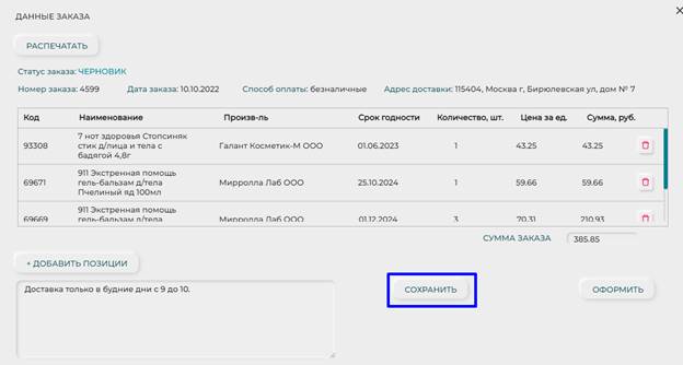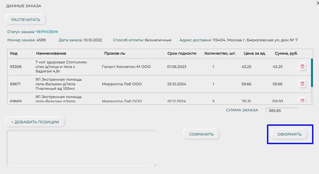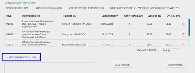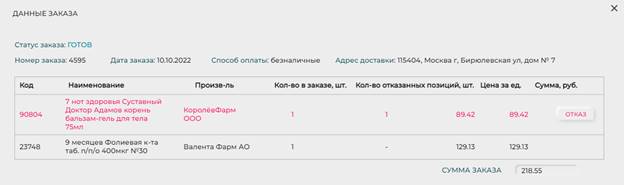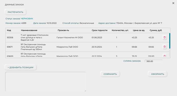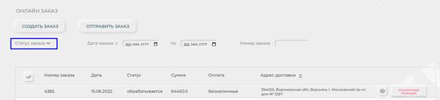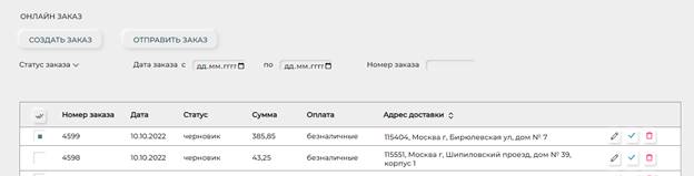 - оформление онлайн заказа; - отображение перечня всех заказов; - возможность просмотра оформленных заказов; - редактирование заказов-черновиков перед отправкой; - просмотр отказанных позиций по заказам. |