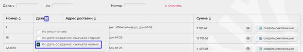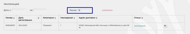 по статусу рассмотрения рекламации. Необходимо в шапке таблицы в поле «Адрес
