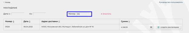 рекламаций по номеру накладной. Необходимо в шапке таблицы в поле «Накладная»