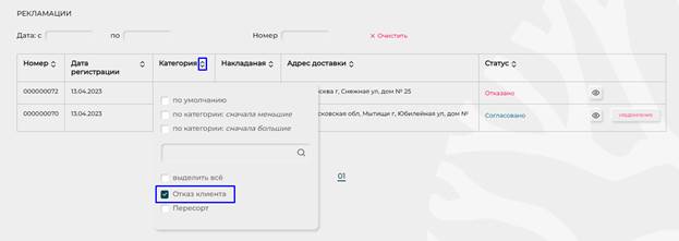 Рисунок 9.2.7 — Настройка отбора по статусу рекламации