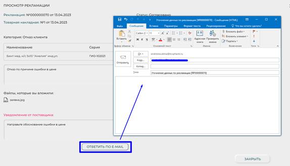 Для ответа на уведомление из ЛК необходимо нажать на кнопку «Ответить по e-mail». При нажатии откроется почтовик с автоматической подстановкой адреса электронной почты ответственного менеджера поставщика (рисунок 9.5.4).