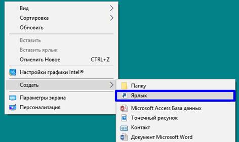 1) Нажать правой кнопкой мыши на экране рабочего стола → Нажать «Создать» → «Ярлык» (Рисунок 10.1).