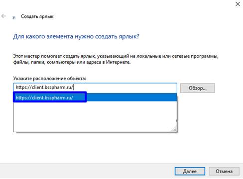 2) В поле «укажите расположение объекта» вставить адрес портала контрагента БСС: https://client.bsspharm.ru/ (Рисунок 10.3).
